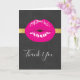 Tack för hälsningskort med en illustration med shock rosa läppar. Fet och pulserande bild. Ställ in på en svart, fläckig bakgrund. En övertoningsremsa i guld bakom bilden.