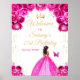 Den här eleganten och den glamorösa födelsedagsfestens välkomstskylt har en vacker prinsessa med mörk hud i en boll-gryning i shock rosa. Texten kombinerar handskript och modernt sans serif typsnitt för ett klassligt och sofistikerat utseende. Blommigten, fjärilen och guld-konetti skapar perfekten blandning av rustika och chic. Grafik efter www.etsy.com/uk/shop/SunflowerDayLove