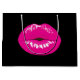 En presentpåse med teckning av ett par glansigt rosa feminin läppar mot svart bakgrund.
