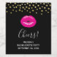 Bachelorette-partyt eller andra flaska-evenemangsetiketter med en teckning av ett glänsande rosa feminin läppar mot svart bakgrund. Faux guld foil konetti-bild längs överkanten.