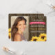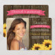 Lägg till din favoritklass bild i de här fotoannonserna och inbjudningarna till solrosfotona i studenten med en vintage i land. Den halvgyllene gulten solblommor gräns denna nya grad inbjudan med en bruna träbakgrund med nagelns huvudstam som påminner en av gamla hönshus, ett bondhus eller en tunna. Lägg till året för din akademiska klass på den shock rosa som tryckts på banderollbilden. Information om ceremonin i Studenten och firandet av party kan läggas till i slutet av denna inbjudan. Design © Krissy H. Studios, LLC. Alla höger reserverade.