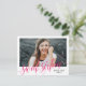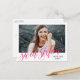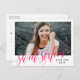 Söt 16 spara vykortet med Sweet sixteen skrivet i ett kort kalligrafiskt skript för shock rosa på ett foto av födelsedagsflickan. Lägg till informationen på baksidan av vykortet i svartvitt och rosa.