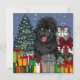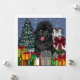 Vacker handritad och färgad Newfoundland valp avbildad i en hög med julklappar under trädet!