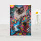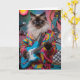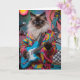 En siamesisk katt i psykodelisk garb spelar elgitarr.