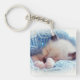 Ett foto av en söt siamesisk kattunge som sover i en pastellblå babyfilt med söt, vit snöskon tass med rosa dynor som kläms upp av ansikte.