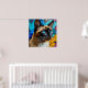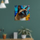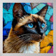 En fängslande konstnärlig representation av en siamesisk katt, med fantastiska blå ögon mot en dynamisk och färgrik abstrakt bakgrund. Perfekt för teman som husdjur, kreativitet och konstnärligt uttryck.