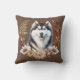 Ett vackert porträtt i en hund i Siberian husky ligger mitt i en höstandekrans i toner av brunt, brunt, brunt och grädde. Utformningen av hund och andedräkt placeras på en ljusbrun bakgrund. Båda sidorna av kudden har samma bild, men baksidan har en mörkare brun bakgrund.