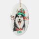 Ett vackert Siberian husky bär en röd och grönt Jultomten hatt framför röda och grönt jul-pärlor på båda sidor om detta prydnadsämne. Vid grund finns två texter där fält matchar rött och grönt för din egen text. Baksidan har samma bild med en tredje fält i rött. Perfekt för alla som ägs av en Husky!