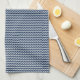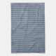 Kökshandduk visas i ett blått och vitt sicksackmönster.