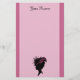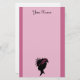 Denna beställnings- brevpapper är ljus - rosor med två mörkare rosa gränser på varje sida och en svart silhouette av sidan profilerar av huvudet av en Victorian, era somdamen som ha på sig en utsmyckad hatt med rosor, specificerar. skräddarsy ditt namn upptill med mallen.