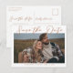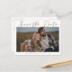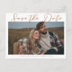 Det här siennabruna bröllopet Spara datum-kortet har en varm kunglig färg ovanför ett höstengagemangsfoto av det lyckliga paret. Det vackra mellanbruna minimalistiska skriptet har enkel kursiv typografi tillsammans med en chic, modern serif-teckensnitt. Denna mjuka bruna färg är perfekt för en höstevenemang på eftermiddagen.