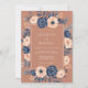 Denna design visar upp djupa marinblå rosor och krämiga vita anemoneblommor mot en varm siennafärgad bakgrund. Arrangemanget inkluderar ömtåliga dammiga blå bär och lövverk som omger den centrala ytan. Det ger en sofistikerad och dyster estetik som är idealisk för en sen säsong eller höstfirande.