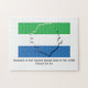 Patriotisk SIERRA LEONEAN FLAGGA Jigszawa Puzzle, som visar karta-konturen i kombination med flagga SIERRE LEONE. Under ANPASSADET finns SCRIPTURE som lyder BLESSED ÄR DEN NATION VARS GOD ÄR LORD, från Psalm 33:12. Texten kan lätt vara personlig med en familj namn eller ett motto. Matchande objekt är tillgängliga.