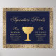 En vintage, elegant skylt för signaturdrycker till bröllop, rekommenderad för ett bröllop med marinblå och gyllene bröllopsfärger. Bakgrunden är marinblå. Den har blomstergyllene ramar med invecklad vildrosor-dekorationer. All text är gyllene. Titeln Signature Drinks och undertitlarna "Hennes" och "Hans" är skrivna med en elegant kalligrafisk stil, resten med versaler. I mitten, mellan Hennes och Hans drinkar, finns ett förgyllt vin glas i folie.