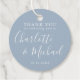 Med signaturstil namn kan denna eleganta dammblå och vita etikett anpassas med din speciella tacksamhetsinformation i chic typsnitt. Designad av Thisisnotme©