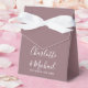Elegant bröllopspresentförpackning med stilrena namn i signaturskript och speciellt datum i modern typografi på lila bakgrund. Du kan anpassa med ditt eget tackmeddelande under locket. Ett perfekt sätt att tacka dina gäster! Designad av Thisisnotme