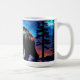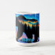 Konstnärlig representation av en björnsilhuett landskap av skogar och berg vid solnedgången, som reflekterar över vatten.