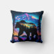 Konstnärlig representation av en björnsilhuett landskap av skogar och berg vid solnedgången, som reflekterar över vatten.
