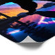Konstnärlig representation av en björnsilhuett landskap av skogar och berg vid solnedgången, som reflekterar över vatten.