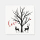 Den pappra party napkin-designen har en silhuettedoe och ett hjort. De står under ett blyfritt träd med en röd fågel som alla är i svart, vitt och rött. ^