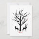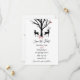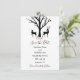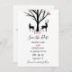 I vinter Spara datummeddelandet från bröllop har en silhuettedoe och ett hjort par. De står under ett blyfritt träd med en röd fågel som alla är i svart, vitt och rött.
