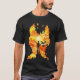 En slående t-shirt-design med en silhuett av en person som står mot en bakgrund av elände, abstrakt mönster liknar lågor. Det glödande sol i mitten symboliserar hoppet, medan de pulserande orange- och gult-tonerna framkallar energi och kreativitet, mot en djärv svart bakgrund för dramatisk kontrast.