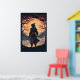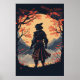 Silhouette från Samurai Warrior med måne, berg och blommande träd.