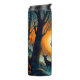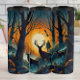 En dramatisk skogsscen vid solnedgången, med hög, barsk träd som ramlar ett ljust, lågt sol. Silhouettes med tre hjortar och en ensam jägare med ett gevär syns mot glasglöden. Fåglarna flyger över huvudet och missen stiger från skogen golv och skapar ett atmosfäriskt och något illavarslande vildmarksband.