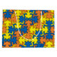 Motif coloré inspiré du style de M.C. Escher, avec des figures géométriques qui s'emboîtent parfaitement. Le design montre des silhouettes stylisées de lézards ou de salamandres voire humanoïdes en bleu, jaune et orange qui se répètent et s'imbriquent comme dans une tessellation, créant un effet de mosaïque continue sans espace vide.