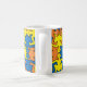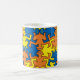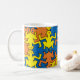 Ce mug présente un motif coloré inspiré du style de M.C. Escher, avec des figures géométriques qui s'emboîtent parfaitement. Le design montre des silhouettes stylisées de lézards ou de salamandres voire humanoïdes en bleu, jaune et orange qui se répètent et s'imbriquent comme dans une tessellation, créant un effet de mosaïque continue sans espace vide