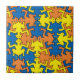 Motif coloré inspiré du style de M.C. Escher, avec des figures géométriques qui s'emboîtent parfaitement. Le design montre des silhouettes stylisées de lézards ou de salamandres voire humanoïdes en bleu, jaune et orange qui se répètent et s'imbriquent comme dans une tessellation, créant un effet de mosaïque continue sans espace vide.