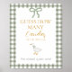 This Silly Goose Is Soon to Be on the Loose Guess How Many game sign adds charm to your baby shower activity table. Featuring the soft green gingham pattern and whimsical white goose, it pairs perfectly with matching game cards and signage in the Silly Goose event suite. Ideal for a goose themed baby shower, green gingham baby shower decor, and baby boy or baby girl shower games.