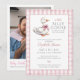 Denna charmiga baby shower-inbjudan har en söt liten gås och en rosa rutmönstrad bakgrund. Baksidan visar ditt speciella foto och en QR-kod till presentregistret. Designad av Thisisnotme