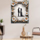 Elegant siluett av ett brudpar som håller hand, inramad med en dekorativ kant prydd med vackra tusenskönor. Perfekt för teman som kärlek, bröllop och romantiska firanden.
