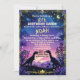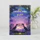 Siluetter av dinosaurier med en stjärnhimmel och en lysande måne i nattlig dinosaurie tema. Perfekt för dinosaurieälskande barn för deras födelsedagsinbjudan.