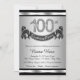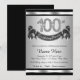 Silver 100-årsdag inbjudan med diamantnummer och lycklig födelsedag banner på en silver och svart bakgrund. Denna vackra 100-årsdag inbjudan är lätt att anpassa för ditt evenemang. Du kan ändra bakgrundsfärgen. Denna slående design fungerar bra för både män och kvinnor. Detta är en tryckt design med inga riktiga diamanter, silver, glitter, etc.
