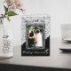 Vit spetskrage och svart bakgrund med svart och silver ram. Silverringar accentuerar. Insidan: Text och ett andra foto som också är elegant inramat. *Anpassningsbar text. Använd mallarna till höger för din bekvämlighet.