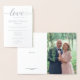 En speciell milstolpe Bröllopsjubileum som 25-årsjubileet förtjänar en elegant silverfolie. "Kärlek misslyckas aldrig", visdomsord i elegant typografi för firandet av silverbröllopet. Anpassa namnen, datum, plats, mottagning, klädsel, foto och RSVP-information på detta stilrena metallfoliekort. Fotot är ett underbart sätt att visa det vackra paret för gästerna.