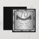 Silver 70-årsfirande inbjudan med diamantnummer och lycklig födelsedag-banner på en silver- och svart bakgrund. Denna vackra silverinbjudan till 70-årsfirande kan enkelt anpassas för ditt evenemang. Du kan ändra bakgrundsfärgen. Denna iögonfallande design fungerar bra för både män och kvinnor. Detta är en tryckt design utan riktiga diamanter, silver, glitter etc.