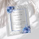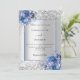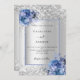 Faux silver tittar bakgrund som dekorerats med blå ro, blommor och konetti. Anpassa och lägg till information om namn och bröllop. Black brev.