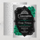 Quinceanera-inbjudan. Snyggtens utformning i emerald grönt och Faux glitter silver. Har skriptteckensnitt, ro, tiara och konetti. Perfekt för en klassgräddprinsessa stil 15-årsdag. Skrivna Zazzle-inbjudningar eller digital utskrivbar mall för omedelbar nedladdning.