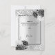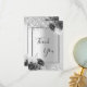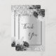 Falsk silverfärgad bakgrund, dekorerad med falskt glitter, gnistrande detaljer och blommor. Framsida med handskriven versal stil och texten: Tack.