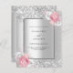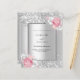 Faux silver tittar bakgrund som dekorerats med rosa och vita blommigtar, blommor och faux silver konetti. Anpassa och lägg till information om namn och party. Black brev. 1 lakan = 1 inbjudan tryckt kant till kant.