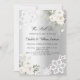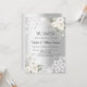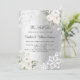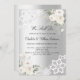 En modern inbjudan till förnyelse av eleganten. En faux silver tittar bakgrund som dekoreras med vita blommigtar, ro och vita snöre. Anpassa och lägg till namn och information.