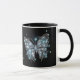 Detta vackra mugg har en bild av ett glittrande silver och en blå fantasi-fjäril. Runt fjärilen lyser silver stjärnor och allt placeras på en dramatisk svart bakgrund. Bilden upprepas två gånger på mugg, med ditt namn i silver mellan dem.