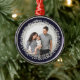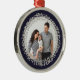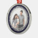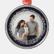 Ett festivt prydnadsföremål med cirkulärt silver som överlappar konetti ring med marint blått gräns och cirkulärt kundfoto i silver ram med rött hängande band. Det här är perfekt för ge presentsäsong eller för att lägga till en minnesstund till ditt eget träd. Underbar för nyfödda, nyfödda, studenter, barn, familjer och husdjur.