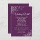 Detta vackra bröllop-kort är ett smakfullt sätt att be era gäster om pengar eller pengarar i stället för presenter. Elegantens utformning har en bakgrund för plumets lila färgad med dekorativa eller dekorativa silver faux-foillhörn och elegantens skriptbokstäver. Titeln lyder "Wishing well" med en söt dikt: När vi börjar vårt nya liv som Mr & Mrs har vi redan ett hus med diskar, men om ni vill ge oss skulle en present från några pengarar vara så trevlig! Det finns plats i grund för en kort-not och namnteckning.