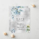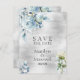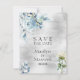 En modern och elegant vattenfärgad inbjudan till bröllop spara datum med en bukett av dammiga blommar med blå peony som hänger från ett gren mot en silver-vattenfärg tvättar med ett livligt slitsteckensnitt.