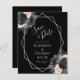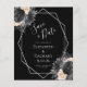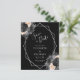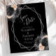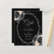 Det här moderna bröllop spara datum-kortet i elegant har ett silver-geometriskt ram som är dekorerat med persiko-, svart- och silver-blommigt-buketter på svart bakgrund. I anpassadet kombineras silver grått med fysisk handskrift, tryckplåt och kursivt typsnitt. Den omvända sidan är helsvart.