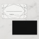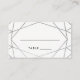 Dessa moderna eskort från bröllop har en silver-geometrisk utformning, med en linje för gästernas namn och bordsnummer, på vit bakgrund. Kortets baksida är svart.
